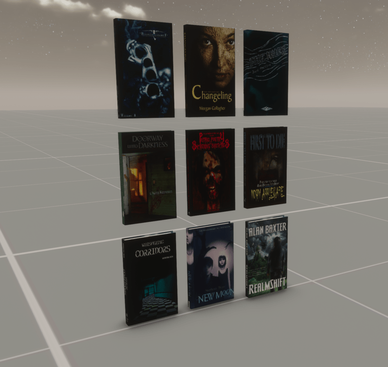 Set of books all in a group. They are set to be dynamic and are scripted. Each book has a volume and grab points. I have them spaced apart just enough so when you drop the book, it will return to its location and not mess up the other books. (fingers crossed)